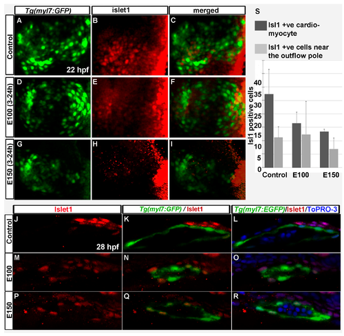 Embryonic ethanol exposure reduced second heart field precursors. (A–I) Anti-Islet1 antibody stained Tg(myl7:GFP) embryos showed Islet1 positive second heart field precursors in the rotating heart cone in control embryos (A–C) at 22 hpf; ethanol exposed embryos showed reduced number of Islet1 positive cells in the heart cones (D–I) at 22 hpf; (J–R) Anti-Islet1 antibody stained Tg(myl7:GFP) embryos showed second heart field derived cardiomyoctes in the heart (Myl7 and Islet1 double positive; red and green) and second heart field precursors (Islet1 positive, red) near the out flow pole in the control embryos (J–L) and ethanol-exposed embryos (M–R) at 28 hpf; (S) Graph shows the quantification of the Islet1/Myl7 double positive cardiomyocytes in the heart tube and Islet1 positive cells near the outflow pole at 28 hpf. EXPRESSION / LABELING: