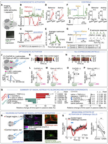 Activation of Radial Astrocytes Reduces Swimming (A) Experimental design. Rat TRPV1 was expressed in ∼1% of radial astrocytes in Tg(gfap:jRGECO1b) fish. Fish were exposed to the TRPV1 agonist capsaicin. (B) Example fish with increased Ca2+ transients in L-MO and concurrent increase in passivity after capsaicin treatment. The effect diminished after ∼1 h, maybe due to TRPV1 desensitization and internalization (Sanz-Salvador et al., 2012), showing that fish remain healthy, as they can swim normally. Dashed line (passive) means the fish is passive 100% of the time; dashed line (active) means it is passive 0% of the time (both measured in 2 min bins). (C) Population data, showing increased passivity after activation of TRPV1. n = 7 fish. (D) Population data of L-MO astrocytic Ca2+ increase and passivity with TRPV1 activation. Two-tailed paired t test, behavior: p = 0.0029, n = 7 fish. ΔF/F: p = 0.027, n = 5 fish. (E) Astrocytic Ca2+ in L-MO near passivity onset. Average signal increased just before passivity onset and peaked just after, as in futility-induced passivity (Figures 2G–2I). Shading, SEM. (F) Control, example. No reduction of swimming or increase in astrocytic Ca2+ when saline was added to fish expressing TRPV1. (G) Control, population data. No change in behavior when saline was added to fish expressing TRPV1 (n = 6 fish) or capsaicin to fish without TRPV1 (n = 5 fish). (H) Summary of controls. Experiments as in (F) and (G) were pooled. Two-tailed paired t test, behavior: p = 0.48, n = 11 fish. ΔF/F: p = 0.51, n = 7 fish. (I) Normalized mean L-MO glial Ca2+ signals centered on the onset of passivity, induced by TRPV1 in closed loop (top) or by motor futility in open loop (bottom). Surges appear similar. Ca2+ in TRPV1+ animals did not saturate. (J) Experimental design. Local optogenetic excitation of glial processes in fish expressing CoChR or Opto-α1-AR increases glial Ca2+ in L-MO (CoChR shown). (K) Optogenetic (CoChR) excitation of L-MO glia reduced swimming for ∼10 s. Blue light outside the brain caused a much milder and briefer reduction. (L and M) Population data show reduced swimming relative to controls in fish expressing CoChR (L) or Opto-α1-AR (M) in radial astrocytes. Two-tailed paired t test, CoChR, p = 0.00012, n = 9 fish; Opto-α1-AR, p = 0.0065, n = 10 fish. (N–P) Controls for (K)–(M) show no effect in fish without CoChR or Opto-α1-AR. Two-tailed paired t test, CoChR: p = 0.89, n = 6 fish. Opto-α1-AR, p = 0.50, n = 8 fish. (Q) Summary of Figures 4 and 5, showing significant increases in passivity after increases in astrocytic Ca2+, decreases after astrocytic silencing, and no effects in control experiments. Effects are normalized by maximal possible change (control passive % for decreases; control active % for increases) for each fish. (R) Optogenetic activation of L-MO radial astrocytes activates GABAergic neurons at edge of L-MO in Tg(gfap:CoChR-eGFP);Tg(elavl3:jRGECO1b) fish. Left: maximum-intensity projection of ΔF/F after optogenetic activation of radial astrocytes (magenta) and anatomy (cyan) in example fish. Inset: Ca2+ in GABAergic neurons after astrocytic activation; stimulation time in cyan. Top right: Tg(gad1b:RFP);Tg(elavl3:H2B-GCaMP6f) used to label GABAergic neurons; bottom right: Tg(gad1b:Gal4);Tg(UAS:CoChR-eGFP) to sparsely label GABAergic neurons. (S) Activation of GABAergic cells with laser light in Tg(Gad1b:Gal4);Tg(UAS:CoChR-eGFP) suppresses swimming. Two-tailed paired t test, p = 0.0074, n = 7 fish. |