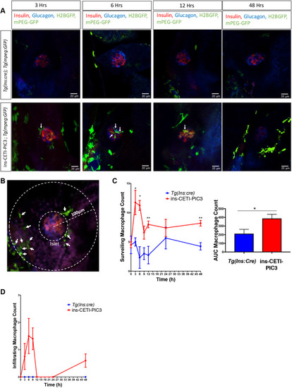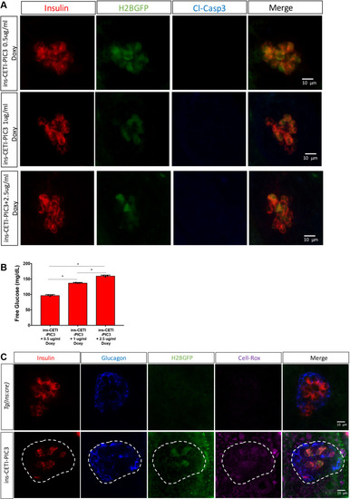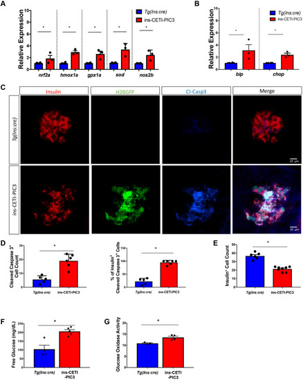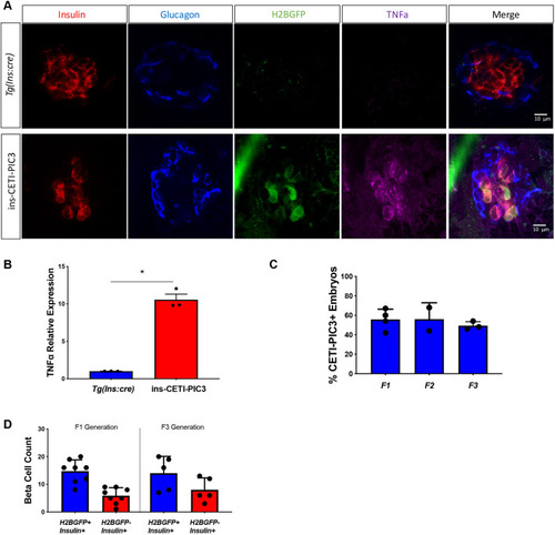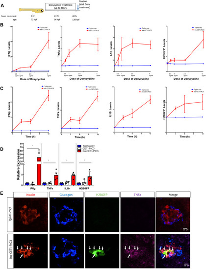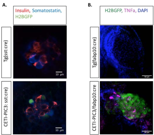 (A) The CETI-PIC3 line was crossed to a somatostatin-cre (Tg(sst:cre)) line to induce cytokines in a delta cell-specific manner. (B) The CETI-PIC3 line was crossed to a liver-cre line (fabp10:cre) to induce cytokines in a hepatocyte-specific manner. |