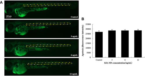 The apoptosis of central cells induced by SiO2 NPs exposure was determined using acridine orange staining in embryos of zebrafish after a 24 h exposure. (A) Central cell apoptosis images were detected by fluorescence microscope. (B) The relative fluorescence of apoptosis of central cells was detected. Data are expressed as means S.D. from three independent experiments. |
