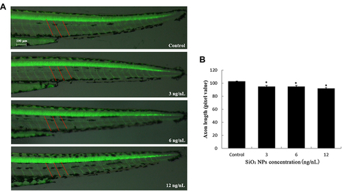 SiO2 NPs induced neurotoxicity in zebrafish. (A) SiO2 NPs disrupted the axonal integrity via the alteration in axon length in Tg (NBT:EGFP) lines. (B) Changes induced by SiO2 NPs in the axon length of zebrafish embryos were detected by NIS-Elements D 3.10 software. Data are expressed as means S.D. from three independent experiments (*p<0.05). |