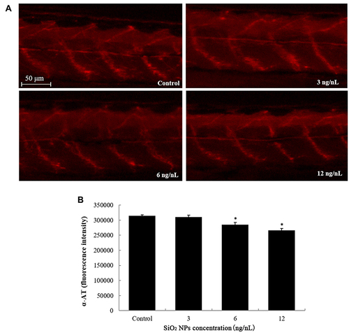 SiO2 NPs induced neurotoxicity in zebrafish. (A) SiO2 NPs caused disruption of axon pattern. (B) Changes induced by SiO2 NPs in the axon structure of zebrafish embryos were detected by NIS-Elements D 3.10 software. Data are expressed as means S.D. from three independent experiments (*p<0.05). |