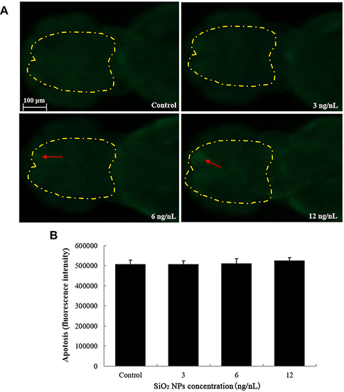 The apoptosis of brain cells induced by SiO2 NPs exposure was determined using acridine orange staining in embryos of zebrafish after a 24 h exposure. (A) The images of apoptosis of brain cells were detected by fluorescence microscope. (B) The relative fluorescence of cellular apoptosis of brain was detected. Data are expressed as means S.D. from three independent experiments. |