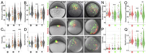 Cells from haploid and tetraploid embryos migrate suboptimally during gastrulation. Cell migration quantification from shield to bud stages of gastrulation in mosaic (A–D) and chimeric embryos (E–Q). For comparisons across experimental conditions and individual timelapses, the quantifications shown are for a normalized duration of 60 min. Graphs show the distribution of total distance travelled (A), displacement (B), tortuosity (C) and speed (D) of 90 cells from 3 diploid (D), 4 haploid (H) and 4 tetraploid (T) embryos. Diploid red cells co-transplanted with diploid green cells tend to mix during migration (E–G). Diploid (red) cells co-transplanted with haploid or tetraploid (green) cells into diploid hosts at sphere stage (4hpf, H, K) and imaged through gastrulation (I, J, L, M), in which the haploid and tetraploid cells are always farther away from the dorsal shield (D). Graphs show the distribution of total distance travelled (N), displacement (O) tortuosity (P) and speed (Q) of 80 diploid (D, red), haploid (H, green) and tetraploid (T, green) from 5 host embryos of each co-transplant. Asterisks denote statistical significance based on Mann Whitney (p < 0.0001, 0.001 and < 0.05) and dotted horizontal line within box plots indicate mean value. Dots represent individual cells and colours of the dots represent individual embryos quantified from independent experiments. |