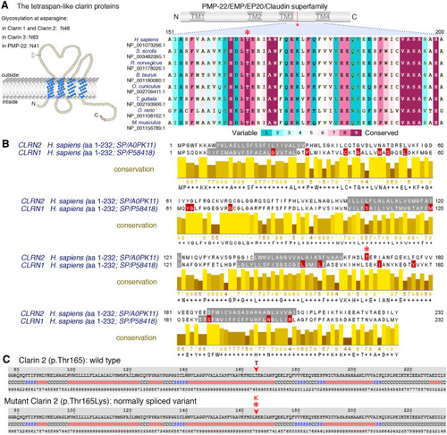 Conservation of the p.Thr165 residue, and clarin 1/clarin 2 alignment. |