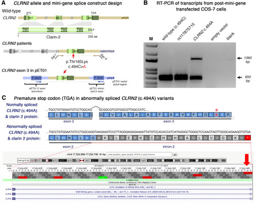 Analysis of the CLRN2 c.494C > A variant on splicing. a Schematic illustration of the mini-gene splice construct design. Genomic representation of CLRN2, including the position of the missense variant c.494C > A (arrow) on exon 3 with 3′ UTR (green), and the 5′ UTR, as well as exons 1 and 2 (grey) (upper panel). Regions captured by mini-gene PCR primers are represented in brown. Schematic illustration of the mini-gene splice construct including exon 3 and its flanking sequence (green) cloned into multiple cloning sites (SalI and SacII sites) of pET01 backbone vector (lower panel). Blue boxes represent native exons of the pET01 vector. b RT-PCR of transcripts from post-mini-gene transfected COS-7 cells. Amplicons derived from the transcripts of WT (CLRN2), a benign CLRN2 polymorphism (rs117875715, chr4(GRCh37):g.17,528,480G > A), the CLRN2 c.494C > A variant and a negative control, were visualized on a 1.5% agarose gel. The SNP, rs117875715, was used to test and validate the designed WT and mutant mini-gene assay. The ~ 650 bp amplicon was associated with the WT and validation control rs117875715. The amplicon derived from the CLRN2 c.494C > A transcripts showed two bands: a 650 bp band and a larger ~ 1360 bp band, indicating retention of intron separating the donor site of the 5′ exon and the acceptor site of CLRN2 exon 3. c Retention of intron in CLRN2 c.494C > A mini-gene results in a stop codon (TGA) after CLRN2 exon 2 |