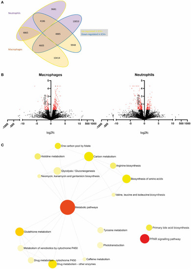 An example of primary analysis suggests metabolic pathways are dysregulated in leukocytes following ICH in zebrafish larvae. (A) Summary of gene expression across leukocyte samples in response to hemorrhage. Values outlined in yellow are upregulated and those outlined in blue are downregulated in hemorrhage. Values of genes expressed in neutrophils are in purple bubbles and those in macrophages are in orange bubbles. (B) Volcano plots showing the log2 fold change of gene expression in macrophages (left panel) and neutrophils (right panel) when compared to ICH– samples. Significant genes (p < 0.05, log10 > 1.3) are in red. (C) Network analysis reveals dysregulation in metabolic pathways in leukocytes following ICH. Metabolic pathways and PPAR signaling pathway pAdj = 0.004.