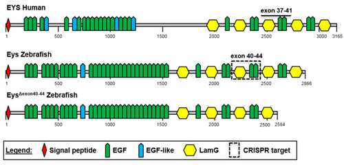 Schematic representation of the domain architecture of human and zebrafish EYS proteins. Both human and zebrafish EYS proteins are comprised of a repetitive protein domain architecture that includes epidermal growth factor (EGF) domains, EGF-like domains and laminin G (LamG) domains. Skipping of eys exon 40-44 results in the exclusion of one LamG and two EGF domains, indicated with a dashed boxed. Numbers indicate amino acids. |