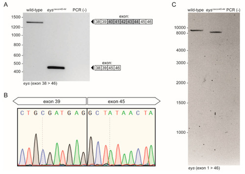 Characterization of the stable eysΔexon40-44 zebrafish line. (A) Schematic representation of exon excision approach (upper panel). Sanger sequencing confirmed the presence of the anticipated exons 40-44 excision in injected embryos (1 day post fertilization (dpf)); lower panel). (B) PCR analysis identified germline transmission in 8 out of 8 pools of 1 dpf embryos obtained by breeding an injected adult with a wild-type animal. PCR (+): positive PCR control, PCR (-): negative PCR control. |