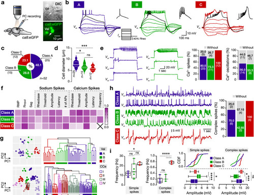 Variable firing, cellular, and spontaneous activity properties of the adult zebrafish valvular Purkinje cells. ( |