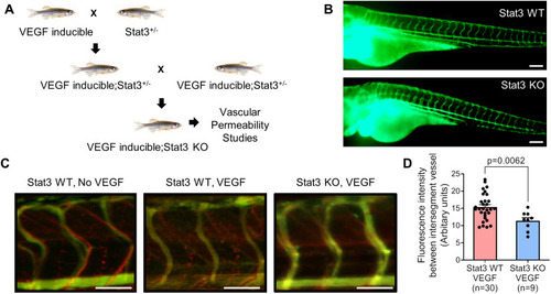 VEGF-induced vascular permeability is reduced upon CRISPR/Cas9-mediated knockout of Stat3 in zebrafish. (A) VEGF-inducible zebrafish were crossed to Stat3+/− (heterozygous) zebrafish to generate VEGF-inducible; Stat3+/− double transgenic fish, which were intercrossed to generate VEGF-inducible; Stat3−/− (KO) zebrafish. (B) CRISPR/Cas9-generated Stat3 KO zebrafish (bottom) display no overt vascular defects relative to wild-type (WT) zebrafish (top). The vascular system of 3 days post-fertilization (dpf) zebrafish was visualized by microangiography with 2000 kDa FITC-dextran. Representative images of at least three zebrafish per group are shown. Scale bars: 100 μm. (C) Microangiography using 70 kDa Texas Red-dextran permeabilizing tracer (red) and 2000 kDa FITC-dextran intersegmental vessel marker (green) was performed on 3 dpf Stat3+/+ (negative controls without VEGF induction; left), VEGF-induced, Stat3+/+ (middle) and VEGF-induced, Stat3−/− (right) zebrafish. Representative images shown were obtained using a Zeiss Apotome 2 microscope with a Fluar 5×/0.25 NA lens at room temperature (RT). Scale bars: 50 μm. (D) Quantitative analysis of vascular permeability upon VEGF stimulation in WT Stat3+/+ (n=30) and KO Stat3−/− (n=9) zebrafish. Mean±s.e.m., unpaired, two-tailed Student's t-test. |