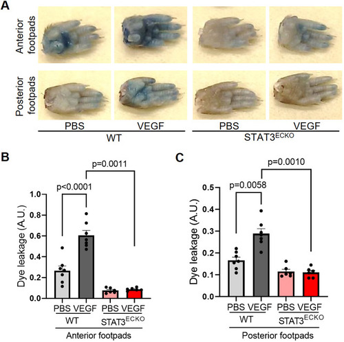 Endothelial cell-specific STAT3 knockout mice exhibit decreased VEGF-induced permeability. (A) Images of footpads from WT and endothelial cell-specific STAT3 knockout (STAT3ECKO) mice following tail vein injection with 1% Evans Blue dye and human recombinant VEGF-165 protein (2.5 µg/ml; left footpads) or PBS vehicle (right footpads) being injected into the root of the footpad. (B,C) Quantitation of Evans Blue leakage in Tie2-Cre negative; STAT3flox/flox (WT) and Tie2-Cre positive; STAT3flox/flox (STAT3ECKO) mice. n=7 mice in WT group and n=6 mice in STAT3ECKO group. Each mouse was injected with PBS on the right anterior and posterior footpads and VEGF on the left anterior and posterior footpads. Multiple biological replicates were performed and depicted findings are representative. Mean±s.e.m., one-way ANOVA followed by Bonferroni test. A.U., arbitrary units. |