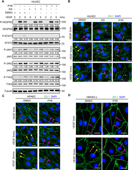 Pharmacological inhibition of STAT3 stabilizes endothelial barrier integrity following VEGF stimulation in human endothelial cells. (A) Serum-starved human umbilical vein endothelial cells (HUVECs) were pretreated with DMSO (vehicle control) for 1 h, 30 µM AQ for 4 h, or 10 µM PYR for 1 h prior to VEGF (25 ng/ml) stimulation for 0, 2 or 5 min. Lysates were immunoblotted. Densitometry was performed, and the values below the rows of bands represent the ratio of phosphorylated protein to respective total protein. (B) Human VEGF-165 recombinant protein (VEGF; 25 ng/ml) stimulation of HUVECs promotes ZO-1 (green) disorganization at endothelial cell junctions (yellow arrows; left column; DMSO vehicle control pretreatment for 1 h prior to VEGF stimulation). ZO-1 organization is maintained upon pretreatment with 30 μM AQ for 4 h (magenta arrows; middle column) or 10 μM PYR for 1 h (magenta arrows; right column) prior to VEGF stimulation. Nuclei were stained with DAPI (blue). (C) Serum-starved human pulmonary artery endothelial cells (HPAECs) were pretreated with 10 µM PYR for 1 h prior to VEGF (25 ng/ml) stimulation for 0, 5 or 30 min. VEGF stimulation promotes disorganization of ZO-1 (green) at endothelial cell junctions (yellow arrows). ZO-1 organization is maintained when HPAECs were pretreated with PYR (magenta arrows). Nuclei were stained with DAPI (blue). (D) VEGF (25 ng/ml) stimulation of human lung microvascular endothelial cells (HMVEC-Ls) promotes ZO-1 (green) disorganization at endothelial cell junctions (yellow arrows). ZO-1 organization is maintained upon pretreatment with 20 μM PYR for 6 h prior to VEGF stimulation (magenta arrows). Nuclei were stained with DAPI (blue). At least two biological replicates were performed for each experiment depicted in A-D. Scale bars: 20 µm. |