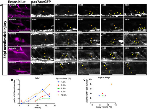 FIGURE 2. Time-lapsed imaging reveals the extent of the muSC response is related to the injury size. Images from time-lapsed movies reveal pax7a:eGFP-expressing muSCs (arrowheads) respond to injury (asterisk) labeled with Evans Blue (magenta) in the myotome of five representative 3 dpf larvae (A, animals 1–5). Images were acquired on a multiphoton microscope and maximum intensity projections generated. The number of pax7a:eGFP+ cells in the myotome was quantified and plotted against time (B) and injury volume (C). Each colored line (B) or dot (C) represents a single animal. Scale bars: 100 μm (A). |