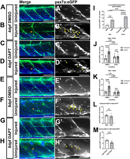 Muscle injury results in an increased number of pax7a:egfp-expressing cells within the myotome at 3 and 7 dpf. Projections of confocal z-stacks of the myotome in uninjured |