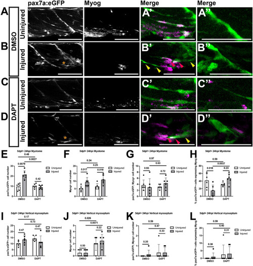 A loss of Notch activity attenuates the muSC response to injury. Projections of confocal stacks of the myotome in uninjured |