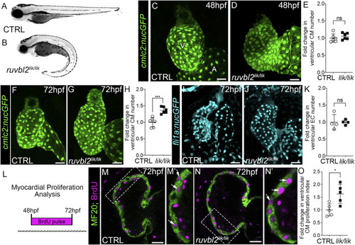 ruvbl2 lik mutant hearts show increased cardiomyocyte proliferation. Brightfield images of wild-type (A) and ruvbl2 lik/lik (B) embryos at 72 hpf. Anterior left, lateral view. (C,D) Confocal projections of fluorescent cardiomyocyte nuclei in hearts of 48 hpf control (CTRL) sibling (C; n = 6) and ruvbl2 lik/lik (D, n = 6) Tg (cmlc2:nucGFP) embryos V = ventricle; A = atrium. (E) Quantification of fold change in ventricular cardiomyocyte number in 48 hpf CTRL and ruvbl2 lik/lik hearts. Means ± s.d are shown. Not significant (ns); p > 0.05. (F,G) Confocal projections of fluorescent cardiomyocyte nuclei in hearts of 72 hpf CTRL (F; n = 6) and ruvbl2 lik/lik (G; n = 6) Tg (cmlc2:nucGFP) embryos. (H) Quantification of fold change in ventricular cardiomyocyte number in 72 hpf CTRL and ruvbl2 lik/lik hearts. Means ± s.d are shown. ***p < 0.0005. (I,J) Confocal projections of fluorescent endocardial nuclei in hearts of 72 hpf CTRL (I; n = 4) and ruvbl2 lik/lik (J; n = 4) Tg (fli1a:nucGFP) embryos. (K) Quantification of fold change in ventricular endocardial cell number in 72 hpf CTRL and ruvbl2 lik/lik hearts. Means ± s.d are shown. Not significant (ns); p > 0.05. (L) Schematic representing the myocardial proliferation assay by BrdU pulse between 48 and 72 hpf. (M–N′) Single plane confocal images of CTRL (M; n = 5) and ruvbl2 lik/lik (N; n = 5) hearts double immunostained to detect cycling (BrdU+) cardiomyocytes (MF20+) at 72 hpf. Boxed regions in (M,N) are magnified in (M′,N′) with white arrows highlighting double positive cells. (O) Quantification of cardiomyocyte proliferation indices in CTRL and ruvbl2 lik/lik ventricles. Means ± s.d are shown. *p < 0.05. Scale bars: 25 μm. |