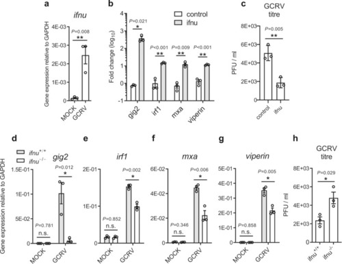 Analyses of ISG expression (a) and viral titer (b) in ifnur1 and crfb4 deficiency and WT zebrafish stimulated by IFN-υ. Embryos (n = 150) at one-cell stage were micro-injected with IFN-υ or control plasmids for 72 h, and hatched zebrafish larvae (n = 33) were collected for quantitative RT-PCR detection or infected with GCRV for 24 h to determine viral titer. The expression of ISGs was normalized against gapdh. Data are expressed as mean ± SEM from three independent experiments. The two-tailed Student’s t test was used to determine the statistical significance, with * indicating P < 0.05, and ** indicating P < 0.01, n.s. non-significancy. |