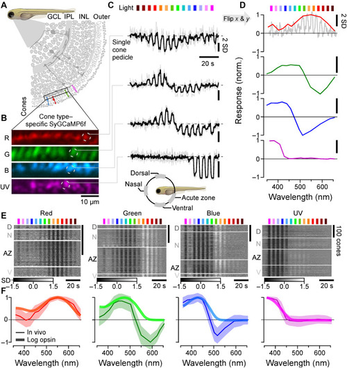 In vivo spectral tuning of larval zebrafish cones and HC block. (A) Schematic of larva zebrafish retina, with position of cone pedicles highlighted [adapted from (82)]. (B and C) Example scans of the four spectral cones (B) (Methods) with single pedicle response examples for each (C) to 3-s flashes of light from each of the 14 LEDs [see fig. S1 (A to C)]. The means superimposed on individual repeats are shown. (D) Example spectral responses summarized from (C). Note that in this representation, both the x and y axes are flipped relative to the raw responses. (E and F) Population responses of each cone type recorded in different parts of the eye (D, dorsal; N, nasal; AZ, acute zone; V, ventral; see schematic inset above for anatomical reference; vertical scale bars indicate n = 100 cones; see also fig. S1G) (E) and population mean ± 95% confidence intervals with log-transformed respective opsin template superimposed (F) (Methods). Heatmaps (E) are time-inverted to facilitate comparison to summary plots (F); grayscale bars are in z scores. Darker shades indicate a drop in calcium relative to baseline, indicative of a cone’s “intrinsic” light response, while lighter shades indicate a rise in calcium, indicative of sign-inverted inputs from the outer retinal network (see Fig. 2). |
