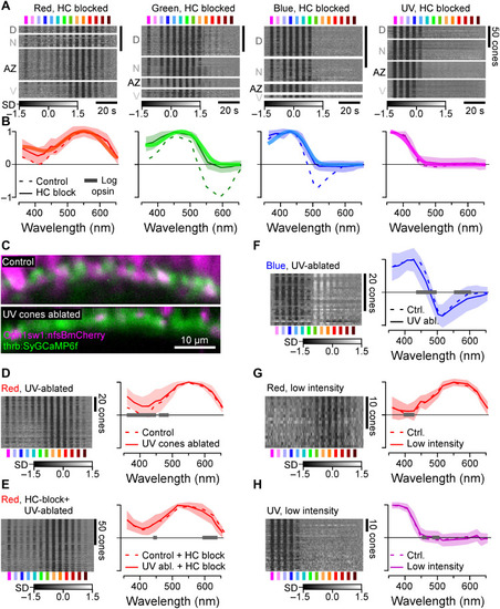 Opsin-like cone responses in the absence of HCs. (A and B) Population responses of each cone type during pharmacological blockage of HCs (A) (Methods) and population mean ± 95% confidence intervals with log-transformed respective opsin template superimposed (B) (Methods). (C) Pharmacogenetic UV cone ablation in the background of red cone GCaMP labeling before (top) and 24 hours after 2-hour treatment of metronidazole (10 mM) application (bottom) (Methods). (D and E) Red cone tunings after UV cone ablation (n = 77) (D) and after additional pharmacological HC blockage (n = 103) (E). Heatmaps (left) and means ± SD (solid lines and shadings) and analogous data in the presence of UV cones (dotted, from Figs. 1F and and2B)2B) are shown. Note that the 361-nm LED was omitted in this experiment. (F) As (D), but here, recording from blue cones (n = 30). (G and H) Red (n = 17) (G) and UV cone tunings (n = 43) (H) at about ninefold reduced overall stimulus-light intensities (solid lines and shadings; Methods), compared to tunings at “standard” light intensities (from Fig. 1F). Gray bars on the x axis in (D) to (H) indicate significant differences based on the 99% confidence intervals of the fitted generalized additive models (GAMs) (Methods). Note that heatmaps (A and D to H) are time-inverted to facilitate comparison to summary plots (B and D to H). Grayscale bars are in z scores. |
