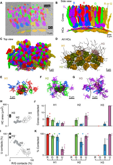 Connectomic reconstruction of outer retinal circuitry. (A) Example vertical EM section through the outer retina, with cones and HCs painted. Cones are color coded by their spectral identity, with “yellow cones” indicating red or green cones at the section edge that could not be unequivocally attributed (Methods); HCs: H1, yellow/brown; H2, dark green; and H3, light pink. (B to D) Full volumetric reconstruction of all cones and skeletonized HCs in this patch of retina, shown from the side (B), top (C), and HCs only (D). (E to G) Example individual HCs classified as H1 (E), H2 (F), and H3 (G) with connecting cone pedicles. (H to K) Quantification of HC dendritic area (H) (cf. fig. S3G) and cone contacts (J and K) shown as absolute numbers with bootstrapped 95% confidence intervals (J) and percentage of cones in dendritic territory with binomial confidence intervals (I and K). |