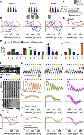 Spectral tuning of cones by HCs. (A to E) Linear model of spectral tuning in an outer retinal network composed of four cone types and three HC types, with maximum connectivity matrix defined as in Fig. 3K (Methods). Cone tunings are initiated on the basis of in vivo data during HC block (Fig. 2B). Different HC combinations include (A) (from left) the following: no HCs, all HCs, and H1 only. In each case, the model computes resultant cone tunings (solid lines) superimposed on in vivo data in the absence of HC block (shadings, from Fig. 1F) (B) and reconstruction quality (C) as loss relative to the peak performance for the full H1 to H3 model (loss = 0) and in the absence of HCs (loss = 1) and normalized weights such that cones contributing to a given HC, and HCs contributing to the full model, each add up to 1 (D). In addition, resultant HC tunings are shown for the full H1 to H3 model (E). (F to J) In vivo voltage imaging of HC somata’s spectral tuning (Methods). (F and G) Example scan (F) [average image (top) and local response correlation (83) and regions of interest (ROIs; bottom)] and responses (G) (mean superimposed on individual repeats shown for the three HC somata in this scan, of which ROIs 1 and 2 responded broadly across all tested wavelength, while ROI 3 exhibited a clear short-wavelength preference). (H to J) Results of clustering of mean responses from n = 86 ROIs (H) (n = 15 fish) with cluster means (I) and extracted tuning functions (J) (means ± SD). (K and L) Mean tunings of in vivo HC clusters [(K), from (J)] and superposition of each modeled [solid lines, from (E)] and measured [shading, from (K)] HCs. Note that raw (G) and averaged (I) HC responses and the summary heatmap (H) are time inverted to facilitate comparison with summary plots (J to L). The grayscale bar in (H) is in z scores. |