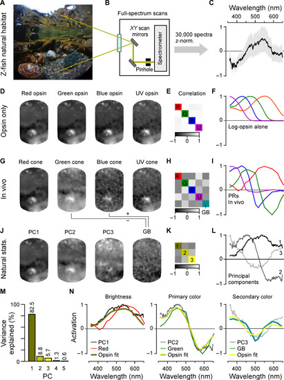 In vivo cone tunings efficiently represent statistics of natural light. (A to C) Hyperspectral data acquisition from zebrafish natural visual world. A 60° window around the visual horizon of an example scene recorded in the zebrafish natural habitat (A) was sampled at 1000 equispaced points with a custom-built spectrometer-based scanner (13) (B) to yield 1000 individual spectral readings from that scene. (C) Summary of the pooled and z-normalized data from n = 30 scenes (30,000 spectra) with mean ± SD [data from (14)]. Photo credit (A): Tom Baden, University of Sussex. (D to L) Reconstructions and analysis of the example scene as seen through different spectral filters: (D to F) log-opsin spectra, (G to I) cone in vivo tunings, and (J to L) based on the first three PCs that emerge from the hyperspectral data shown in (C). From left to right: (D, G, and J) example scene [from (A)] reconstructed on the basis of opsin/in vivo/PC tunings as indicated, (E, H, and K) correlation matrices between these respective reconstructions, and (F, I, and L) the actual tunings/PCs. A fifth element GB (for “green/blue”) is computed for in vivo tunings as contrast between green and blue cone tunings (cf. fig. S5). (M) Percent variance explained by the first five PCs (l). (N) Superposition of cone in vivo tunings (colored lines), PCs, and a linear R/G/B/U log-opsin fit to the respective PC (yellow; Methods). The latter fit can be seen as the biologically plausible optimum match to a given PC that can be achieved in a linear regime. |