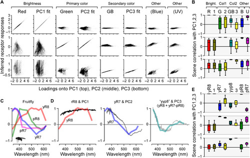 Encoding of natural achromatic and chromatic contrast. (A) Computed responses of in vivo cones, the GB axis, and each respective log-opsin PC fit [all from Fig. 5 (I and N)] to each of the n = 30,000 individual natural spectra, plotted against each spectrum’s loadings onto PC1 (top row), PC2 (middle row), and PC3 (bottom row), as indicated. Responses were plotted on the y axis, and PC loadings were plotted on the x axis. In general, a column that shows a near-perfect correlation in one row, but no correlation in both other rows (e.g., column 1), can be seen as a tuning function that efficiently captures the respective PC (e.g., column 1 shows that red cones efficiently represent PC1 but not PC2 or PC3). (B) Corresponding summary statistics from (A), based on scene-wise Spearman correlations. (C) Spectral tuning functions of Drosophila R7/8 photoreceptors as measured in vivo at their synaptic output [data from (12)]. (D) Comparison of Drosophila tuning functions with the first three PCs that emerge from terrestrial natural scenes [data from (13)]. Here, PC3 is matched with a yyp8 axis as indicated [cf. fig. S6 (D to F)]. (E) Summary stats of Drosophila photoreceptor responses to each of the n = 4000 individual terrestrial natural spectra plotted against their respective PC loadings. |