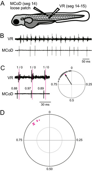 Anti-phasic relationship of the rostral and caudal motor activities is impaired in MCoD-ablated fish. ( |