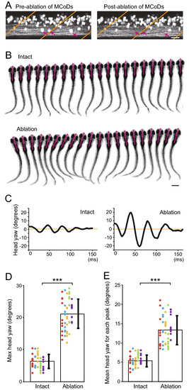 Ablation of MCoD neurons lead to the increase of head-yaw displacement during spontaneous swimming. ( |