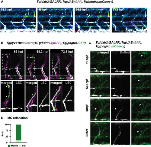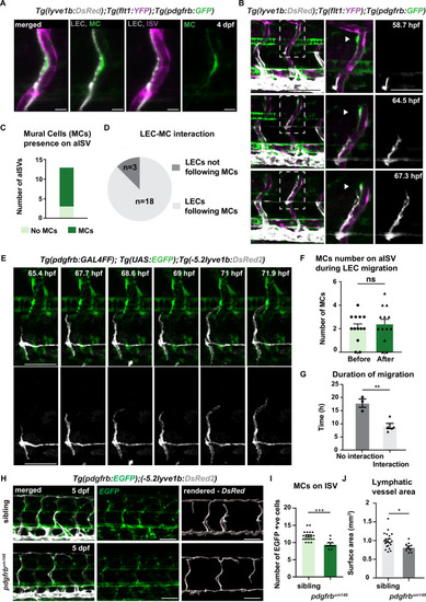(A) Confocal stack image of trunk aISV in 4 dpf Tg(flt1:YFP); Tg(-5.2lyve1b:DsRed2);TgBAC(pdgfrb:GFP) of lymphatic endothelial cells (grey, LEC), arterial intersegments vessels (magenta, aISV) and mural cells (green, MC). Scale bar; 10 μm. (B) Confocal stack images from time-lapse images in the trunk of 2 dpf Tg(flt1:YFP); Tg(-5.2lyve1b:DsRed2); TgBAC(pdgfrb:GFP) embryos (LECs in grey). Boxed regions are enlarged (right panels). Arrowheads indicate pdgfrb+ MCs (green) next to aISVs (magenta during LEC migration). Scale bars; 100 μm or 50 μm (enlarged image). (C) Quantification of aISVs with (n=10) or without (n=3) MCs presence from n=7 embryos when LECs left HM for time lapse videos as in (E). (D) Quantification of LEC and MC interaction during migration (n=10 embryos, with four somites counted per embryo). Migrating following MC n=18, migrating not following MC n=3 from time lapse videos in (E). (E) Confocal stack images from time lapse movies of LEC migration. TgBAC(pdgfrb:GAL4FF);(UAS:GFP) in green and Tg(-5.2lyve1b:DsRed2) in grey. Scale bar: 50 μm (F) Quantification of MC number around aISVs (n=14) from n=7 embryos at the start and end of the migration, quantified from time lapse videos in (E). Data are presented as mean ± SEM, unpaired two-tailed Student’s t-test was used. Ns, no significance. (G) Quantification of duration of LEC migration with (n=5) or without (n=3) contacting MCs from n=6 embryos. Data are presented as mean ± SEM. unpaired two-tailed Student’s t-test was used. **p<0.005 (H) Confocal stack images of Tg(pdgfrb:GAL4FF); Tg(UAS:GFP) (green) and Tg(-5.2lyve1b:DsRed2) (grey) in the trunk of sibling (top) and pdgfrbum148 mutant (bottom) embryos at 5 dpf. Lymphatic vessle are rendered using lyve1b:DsRed2 channel in IMARIS s structure is rendered with lyve1b:DsRed2 channel in IMARIS (right panel). Scale bar: 100 μm. (I) Quantification of pdgfrb+ mural cell numbers around ISVs in siblings (n=20) and pdgfrbum148 mutants (n=10). Data are presented as mean ± SEM, Mann Whitney test was used. ***p<0.0001. (J) Quantification of surface area of lymphatic vasculature in siblings (n=20) and pdgfrbum148 mutants (n=10). Data are presented as mean ± SEM, unpaired two-tailed Student’s t-test was used. *p<0.05.
