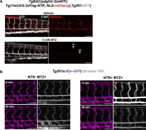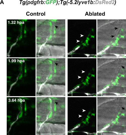 (A) Confocal stack images with transmitted light channel as in Figure 2F. Black arrows indicate erythrocytes in the blood flow, white arrowheads indicate the ablating sites. Scale bar: 50 μm. |
