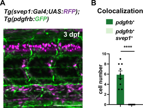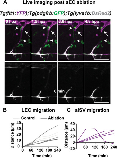 (A) Confocal stack images from time-lapse post multi-photon laser ablation in 2 days post fertilization (dpf) Tg(flt1:YFP) (magenta); TgBAC(pdgfrb:GFP) (green) and Tg(–5.2lyve1b:DsRed2) (grey) embryos. Arrowheads indicate remained GFP+ MCs without arterial intersegmental vessel (aISV). White arrows indicate the ablated site of aISV. Scale bar: 50 μm (Figure 2—figure supplement 2); arterial endothelial cell (aEC) ablation with multi-photon laser. (A–B) Quantification of lymphatic endothelial cell (LEC) (n = 4) and aISV (n = 4) migration distance post two-photon laser ablation. |