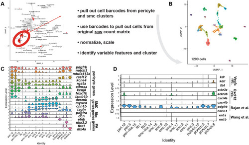 (A) Uniform Manifold Approximation and Projection (UMAP) plot of smooth muscle cells and pericytes subclustered from 5 days post fertilization (dpf) pdgfrb:egfp-positive cells. bulbArt – bulbous arteriosus, fib – fibroblast, peri – pericyte, peri-like – pericyte-like, phArch – pharyngeal arch mesenchymal cell, smc – smooth muscle cell. (B) Violin plot showing markers for pericytes (pdgfrb, ndufa4l2a), smooth muscle (myocd), fibroblasts (pdgfra), bulbous arteriosus (elnb), and pharyngeal arch mesenchyme (nkx3.2, tbx1, dlx4a). (C) Violin plot showing expression of known non-autonomous pro-lymphatic factors. Expression level values are log2 normalized across all cells. (D) Illustration of fluorescence activated cell sorting (FACS) and qPCR analysis on 3 dpf embryos. (E) qRT-qPCR of cxcl12a, cxcl12b, vegfc, ccbe1, and dll4 in FACS sorted trunk arterial endothelial cells (aECs) and MCs cells at 3 dpf as described in (D). Graph represents gene expression relative to geometric average of rpl13 and β-actin from three biological repeats (mean ± SEM). Unpaired two-tailed Student’s t-test or Mann-Whitney test was used. No significance (ns), p ≥ 0.5. *p < 0.05, ***p < 0.0005, ****p < 0.0001. (F) Confocal z-projections for immunohistochemistry of fluorescent proteins in trunks of Tg(vegfc:Gal4; UAS:RFP; pdgfrb:GFP) and confocal image of Tg(ccbe1:YFP;pdgfrb:Gal4; UAS:NTRmcherry) embryos at 3 dpf. Scale bar: 100 μm; 50 μm in enlarged images. (G) Left panel, quantification of colocalization of vegfc+ and pdgfrb+ cells based on immunohistochemistry in (F). Right panel, quantification of colocalization of ccbe1+ and pdgfrb+ cells based on confocal images in (F), data presented as double positive ratio (mean ± SEM). Ns, no significance. (H) Confocal z-projections for immunohistochemistry of endogenous pERK (cyan, right) in migrating lymphatic endothelial cells (LECs) in trunks of Tg(–5.2lyve1b:venus) embryos (α-GFP, grey, middle) (n = 10) at 3 dpf. Scale bar: 100 μm; 50 μm in enlarged images.