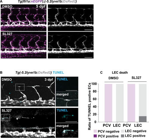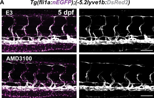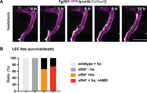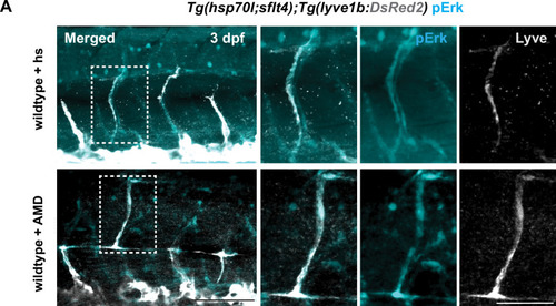 (A) Endogenous pERK (cyan) in migrating lymphatic endothelial cell (LEC) in trunk of 3 dpf Tg(hsp70l;sflt4, cryaa:Cerulean) and Tg(flt1:YFP;lyve1b:DsRed2) embryos (α-DsRed2, grey) with treatment as described in Figure 5A. Box indicates enlarged area. Scale bar: 100 μm; 50 μm in enlarged images.