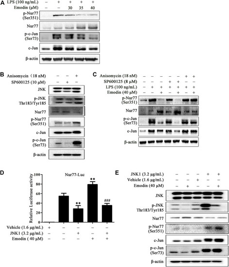 Emodin regulates the Nur77/c-Jun pathway in LPS-stimulated RAW264.7 cells by inhibiting the JNK pathway. |