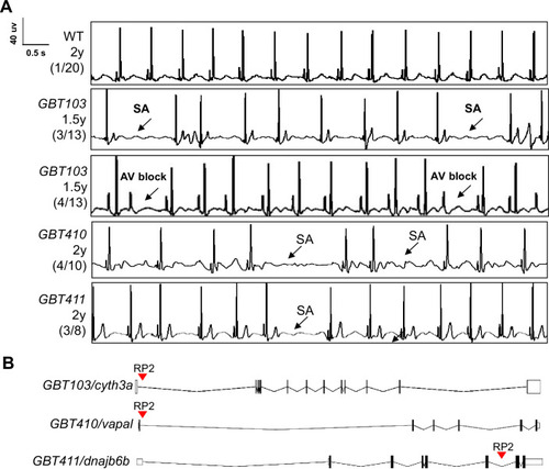 Screening of 35 ZIC lines identified three mutants with increased incidence of SA and/or AVB episodes.(A) Representative ECG recordings for three heterozygous/homozygous GBT mutants with increased incidence of sinus arrest (SA) and/or atrioventricular block (AVB) episodes compared to WT control. (B) RP2 gene-break transposon insertional positions in the three candidate SSS mutants. |