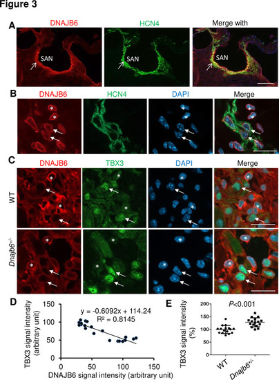 Expression and localization of DNAJB6 in the mouse SAN.(A) The anti-DNAJB6 antibody immunostaining signal largely overlapped with the HCN4 immunostaining signal in the mouse SAN tissues under low magnification. (B) Under higher magnification, expression of DNAJB6 (red) only partially overlapped with HCN4 (green) as revealed by antibody co-immunostaining. Arrows point to cells with overlapping patterns. Stars indicate cells with no-overlapping. (C) Shown are fluorescent images after DNAJB6 and TBX3 antibody co-immunostaining indicating expression of DNAJB6 protein in the WT versus Dnajb6+/- +/- mouse SAN. Arrows point to cells with weak DNAJB6 but strong TBX3 immunostaining signal. Stars indicate cells with strong DNAJB6 but low level of TBX3 immunostaining signal. (D) Quantification and correlation analysis of DNAJB6 and TBX3 immunostaining signal in WT SAN. (E) Quantification analysis of TBX3 signal in the WT versus Dnajb6+/- mouse SAN. N=20 cells. Unpaired student’s t-test. Scale bars in A, 50 µm; In B, C, D, 20 µm. |