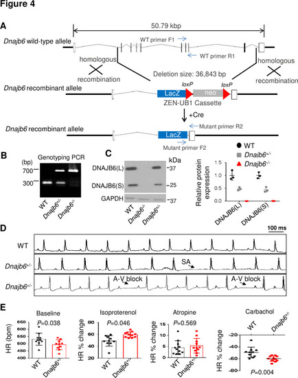 Dnajb6+/- mice exhibited increased incidence of SA and AVB and impaired response to autonomic stimuli. (A) Schematics of the Dnajb6 knockout (KO) mice. The insertion of Velocigene cassette ZEN-Ub1 created a deletion of 36,843 bp nucleotides spanning from the first to the last intron of the Dnajb6 gene at the Chromosome 5. The neomycin selection cassette was excised after crossed to a Cre expression line. (B) Representative DNA gel images of PCR genotyping for identifying WT (300 bp), Dnajb6+/- heterozygous (hets), and Dnajb6-/-homozygous (homo) mutant alleles . (C) Western blotting and quantification of DNAJB6 short (S) and long (L) protein expression in WT and Dnajb6 mutants. N=3 animal per group. (D) Shown are representative ECG recordings results showing SA and AVB phenotypes detected in the Dnajb6+/- mice at 6 months. (E) The Dnajb6+/- mice manifests impaired response to different autonomic stimuli. N=10–12 mice per group, unpaired student’s t-test. SA, sinus arrest. AVB, atrioventricular block. |