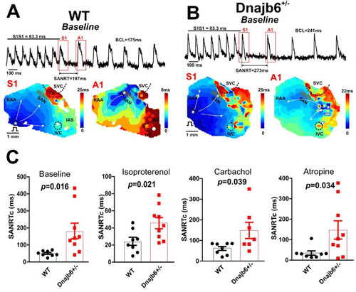 Sinus node recovery time was prolonged in the Dnajb6+/- mice. (A–B) Representative activation maps reconstructed for the last pacing stimulus (S1) and the first spontaneous post-pacing atrial beat (A1) during SAN recovery time (SANRT) measurements are shown. A site of the earliest atrial activation is labeled by a white asterisk. In Dnajb6+/- group, unlike WT, the first spontaneous post-pacing atrial beat (A1) originated from an ectopic location outside of the anatomically and functionally defined SAN area. (C) Summarized data for corrected SANRT (+/-) measured during different autonomic stimulations is shown. N=7–9 mice per group, unpaired student’s t-test. |