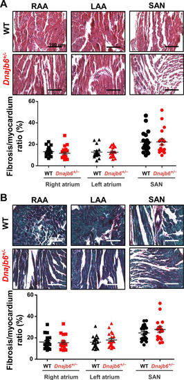 Fibrotic tissue content in atrial and SAN myocardium of Dnajb6+/-vs.WT mice. (A–B) Masson’s Trichrome (A) and Picrosirius Red (B) staining of WT and Dnajb6+/- mice are shown for left (LAA) and right (RAA) atrial appendages as well as SAN regions. Below the representative images, summarized data for fibrotic to myocardial tissue ratio are shown for each staining. N=4 mice per group. Scale bars, 100 µm. |