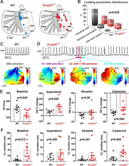 SAN dysfunction in the Dnajb6+/- mice. (A) Leading pacemakers were located and plotted from both WT (blue dots) and Dnajb6+/- (red dots) mice. One mouse could have multiple leading pacemaker locations due to the competing pacemakers and ectopic activities. SVC and IVC, superior and inferior vena cava; RAA, right atrial appendage; CT, crista terminalis; IAS, inter-atrial septum; AVN, atrioventricular node. Distribution of the leading pacemakers is summarized in panel. (B) Majority of leading pacemakers located within the SAN area in WT, whereas, in Dnajb6+/- mice, significant increase of leading pacemakers locating in subsidiary pacemaker area and IAS was observed. p-value by Fisher exact test. (C–D) Activation map based on the optical mapping of action potentials showed representative leading pacemaker locations in WT (SAN) and Dnajb6+/- mice (SAN and IAS areas). (E) Optical mapping on isolated atrial preparation showed bradycardia (baseline) and different responses of heart rate during isoproterenol, atropine, and carbachol stimulations between WT and Dnajb6+/- mice. N=7–9 mice per group. Unpaired student’s t-test. (F) Increased cycle length (CL) variation was observed in Dnajb6+/- isolated atrial preparations during different autonomic stimulations. N = 7–9 mice per group, unpaired student’s t-test. |