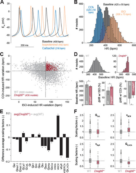 Computational analysis of the cellular mechanisms underlying the SSS phenotype observed in ex vivo mouse experiments.(A) Time course of membrane potential (Em) predicted simulating our computational model of mouse SAN myocyte before (baseline) and after administration of isoproterenol (ISO) or carbachol (CCh). (B) Histogram illustrating the effects of ISO and CCh administration on firing rate (HR) distribution in our population of models. (C) Scatter plot quantifying HR variation in each model in the population. Red dots correspond to model variants resembling properties observed in ex vivo Dnajb6+/- mouse experiments ( +/- slower baseline HR, enhanced response to ISO, and reduced response to CCh), while the remaining model variants in grey mimic WT mouse functional measurements. (D) Histograms comparing the distribution of baseline HR in the two subgroups, and bar graphs reporting average ( ± SD) baseline HR, and relative HR variation after ISO and CCh administration in the two subgroups. (E) Bar graph reporting the differences between average model parameters’ scaling factors in the two subgroups. Note that a positive (negative) bar corresponds to increased (decreased) average parameter value in Dnajb6+/- vs. WT groups. Asterisks in panels D and E indicate significant difference according to the 2-sided Wilcoxon rank sum test (performed with the MATALB function ranksum). (F) Statistical analysis on the values of scaling factors of selected model parameters (GCaL, vNCX, vRyR, and GK,ACh) performed with the MATLAB command boxplot. The central line indicates the median of each group (q50). The central box represents the central +/- % of the data, with lower and upper boundaries corresponding, respectively, to the 25th and 75th percentiles (q25 and q75). The dotted vertical lines extend to 1.5 times the height of box, and individual values falling outside this range (shown here with grey circles) are considered outliers. The extremes of the lateral notches of the central box (determined as q50 ± 1.57(q75–q25)/sqrt(n), where n is the number of observations in each group) mark the 95% confidence interval for the medians. When the notches from two boxplots do not overlap, as in the four cases shown here, one can assume that the medians are different with a significance level of 0.05. |