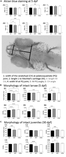 baz1b LoF zebrafish have altered craniofacial features (A) Comparison between genotypes for the cranial features (outlined in the picture below) observed at 5 dpf by Alcian blue staining: ratio 1/2 (A1), ratio 1/3 (A2), ratio 1/4 (A3), ratio 2/3 (A4), ratio 2/4 (A5), and ratio 5/6 (A6). (B) Morphological comparisons of intact 5 dpf for the three genotypes: body length (BL, in mm; B1), eye length (EL) normalized to BL (B2), eye width (EW) normalized to BL (B3), head width (HW) normalized to BL (B4), inter-ocular distance (IOD) normalized to BL (B5), and eye-snout distance (ESD) normalized to BL (B6). (C) Morphological comparison of intact juvenile fish (30 dpf). Graphs show mean ± SEM. In all cases: ∗p < 0.05; ∗∗p < 0.01; ∗∗∗p = 0.001; ∗∗∗∗p < 0.001. Statistical test: one-way ANOVA with Tukey correction for multiple comparison for A1, A3, A5, A6, B2–B6, and C1–C6; non-parametric test of Kruskal-Wallis corrected for multiple comparison for A2, A4, and B1. |