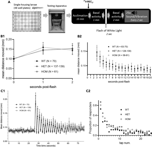 Loss of baz1b diminishes stress response and habituation in the flash of light and acoustic startle assay (A) Diagram of the assay. (B) Flash of light: total distance moved during the flash of light (time 0) and 2 s after. Dots represent distance traveled in 1 s time bins (B1), and mean distance moved during recovery for the 18 s following this period (B2). Dots represent 1 s time bins. (C) Acoustic startle assay: total distance moved 25 s before and during the acoustic cues (C1) and proportion of responders during the acoustic cues (C2). In all cases, data show mean ± SEM. Intragroup variations in N number are due to statistical exclusion criteria applied at each time bin. |