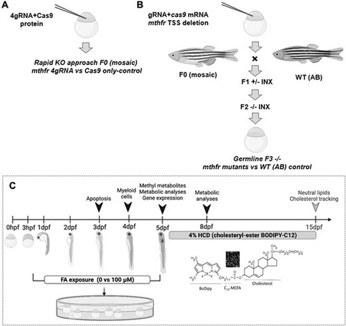mthfr zebrafish model creation and study design. Schematic of the steps to generate (A) 4gRNA mthfr crispant zebrafish and (B) germline mthfr −/− mutant zebrafish (HSC194). (C) Simplified study design. Metabolic analyses included measures of food intake, metabolic rate and lipid accumulation. Analysis indicated by the gray arrowhead was performed following a 10-day HCD challenge. Abbreviations: F0, mutagenized generation; F1 +/−, first-generation zebrafish heterozygous for mthfr; F2 −/−, second-generation zebrafish nullizygous for mthfr; hpf, hours postfertilization; MCFA, medium chain fatty acid; WT, wild-type zebrafish from AB background. |