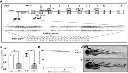 Generation of mthfr-deficient zebrafish by CRISPR mutagenesis. (A) Schematic representation of the zebrafish genome with guide RNA sequences identified in the mthfr gene. The 4gRNA target sequences (gRNA1/2/3/4-4) reside in exons 3, 5, 6 and 9. The two-gRNA approach (gRNA2 and gRNA6) targets sequences in the 5′ UTR and in exon 2, respectively, and results in a 2058 bp deletion (mthfr-atgdel) that includes the TSS. Black arrowheads show where gRNA cutting occurred. Boxes indicate exons, with white boxes representing UTR and gray boxes representing protein coding regions. Primer locations used for sequencing are shown. (B) Relative mthfr mRNA expression in 4gRNA mthfr crispants (4gRNA) and mthfr −/− mutant zebrafish (mthfr −/−, HSC194) compared with their respective controls at 5 dpf. Values are mean ± SEM, n = 2–3 biological replicates of n = 20 pooled zebrafish/group. Each pool was composed of n = 20 larvae. Analyzed by Student’s t-test. Significant at *P < 0.05 and ***P < 0.001. (C) Kaplan–Meier curve showing percent survival of WT and mthfr −/− mutant zebrafish larvae throughout embryonic development from 0 to 5 dpf. n = 60 larvae/group/petri dish at the start of analysis. (D, E) Representative image of (D) WT and (E) mthfr −/− mutant zebrafish at 5 dpf showing no obvious morphological differences. 10× magnification, scale bar = 200 μm. |