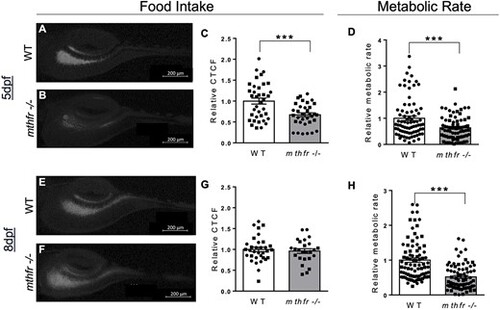 Food intake and metabolic rate are affected by mthfr deficiency in larvae. (A, B) Representative images of zebrafish intestinal content following feeding with fluorescent paramecia in (A) WT controls and (B) mthfr −/− mutant zebrafish (mthfr −/−, HSC194) at 5 dpf. (C) Food intake, measured by relative CTCF, at 5 dpf in WT compared with mthfr −/− mutants. (D) Relative metabolic rate in WT versus mthfr −/− at 5 dpf. (E, F) Representative images following feeding with fluorescent paramecia in (D) WT and (E) mthfr −/− at 8 dpf. (F) Relative CTCF at 8 dpf in WT compared with mthfr −/− mutants. (G) Relative CTCF at 8 dpf in WT compared with mthfr −/− mutants. (H) Relative metabolic rate in WT versus mthfr −/− at 8 dpf. For all food intake measures: 80× magnification, scale bar = 200 μm, n = 20/group. All values are mean ± SEM. Analyzed by Student’s t-test. Significant at *P < 0.05, **P < 0.01, ***P < 0.0001. |