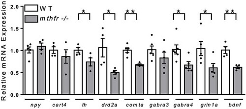 Central regulatory gene expression was altered in mthfr −/− at 5 dpf. All values are relative to control. Mean ± SEM, n = 5 larval heads/pool, 4–5 pools/group. Analyzed by Student’s t-test. Significance at *P < 0.05, **P < 0.01. Abbreviations: mthfr −/−, 5-methylenetrahydrofolate reductase homozygous KO germline zebrafish mutants (HSC194); WT, wild-type control zebrafish. |