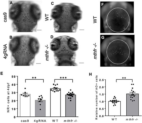 mthfr deficiency in zebrafish reduces microglia and increases apoptosis in the optic tectum. (A–D) Representative bright-field images of NR+ staining at 4 dpf for microglia in (A) cas9, (B) 4gRNA, (C) WT and (D) mthfr −/− mutant zebrafish (mthfr −/−, HSC194). 80× magnification, scale bar = 100 μm. (E) Number of NR+ cells at 4 dpf. n = 8–14 larvae/group. Analyzed by one-way ANCOVA with ‘batch’ as a covariate. Significance at **P < 0.01 and ***P < 0.001. (F, G) Representative fluorescent images of 3 dpf (F) WT and (G) mthfr −/− zebrafish stained with AO. (H) Number of AO+ cells at 3 dpf. White dotted line outlines area of quantification. 80× magnification, scale bar = 200 μm. Analyzed by Student’s t-test. Significant at ***P < 0.001. All values are mean ± SEM. Circles represent one individual zebrafish from batch 1 and squares represent zebrafish from batch 2. |